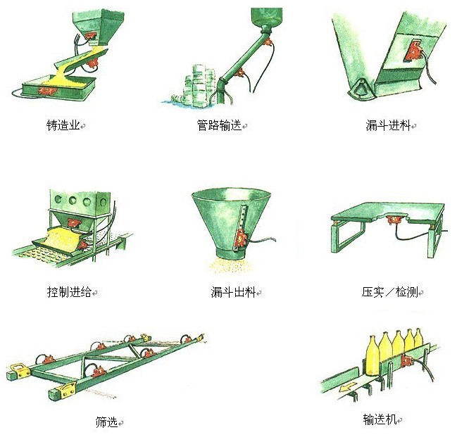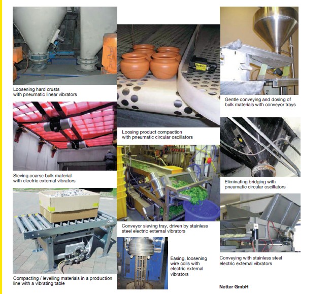 当今大量的工作都由NETTER振动器完成。NETTER振动器主要应用是清空料斗、物料筛选、混凝土捣实以及沙、土及其它任何粉末或小颗粒并螺钉等的给料。在电子工业中也应用振动来检测印刷电路板的接点。